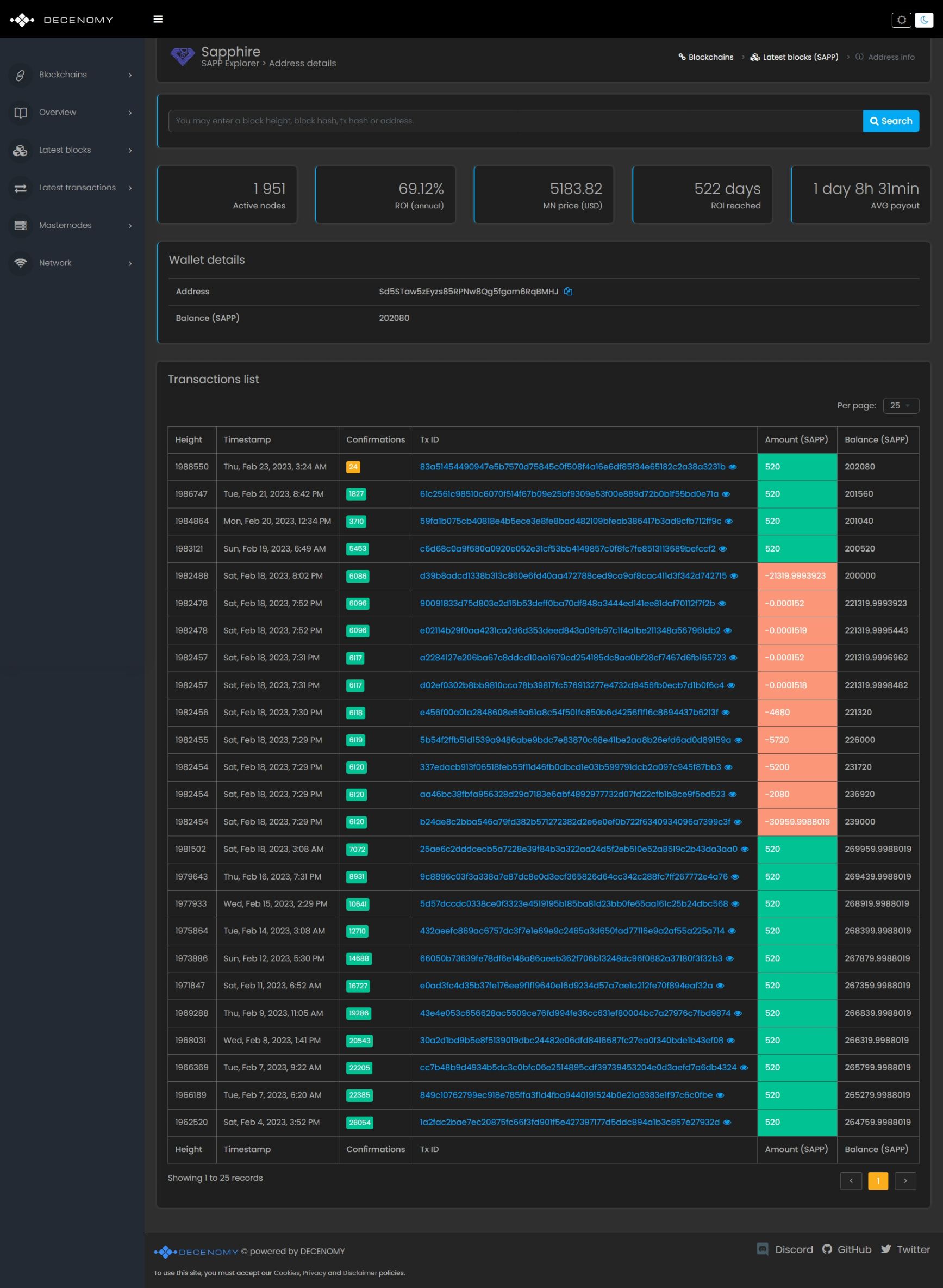 " Height " Refers to the block height at which a transaction containing the queried address occurred. " Timestamp " Exact date and time when the transaction event occurred. " Confirmations " Indicates the number of times the transaction has been confirmed on the blockchain by the time of the query. " Tx ID " The transaction ID " Amount " Shows the number of coins that were moved in the transaction. The field is color-coded to indicate whether the transaction resulted in a credit or debit to the wallet. " Balance " The balance the wallet has after the transaction happens.