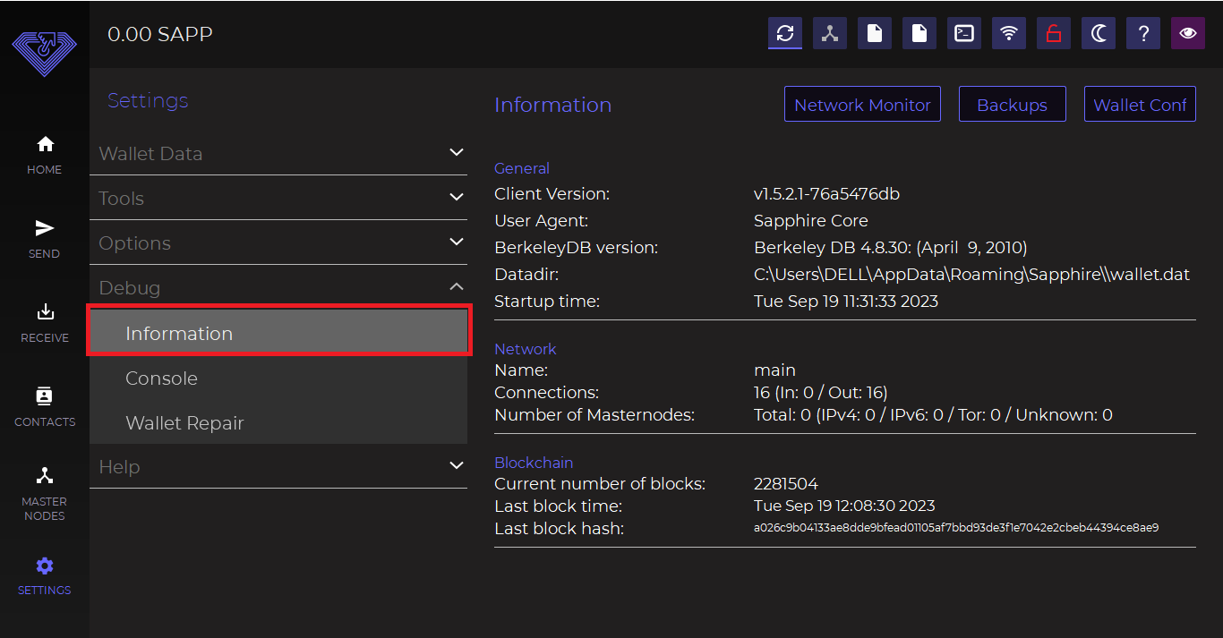 * Information (wallet information such as synchronization status, number of connections, and wallet version)
