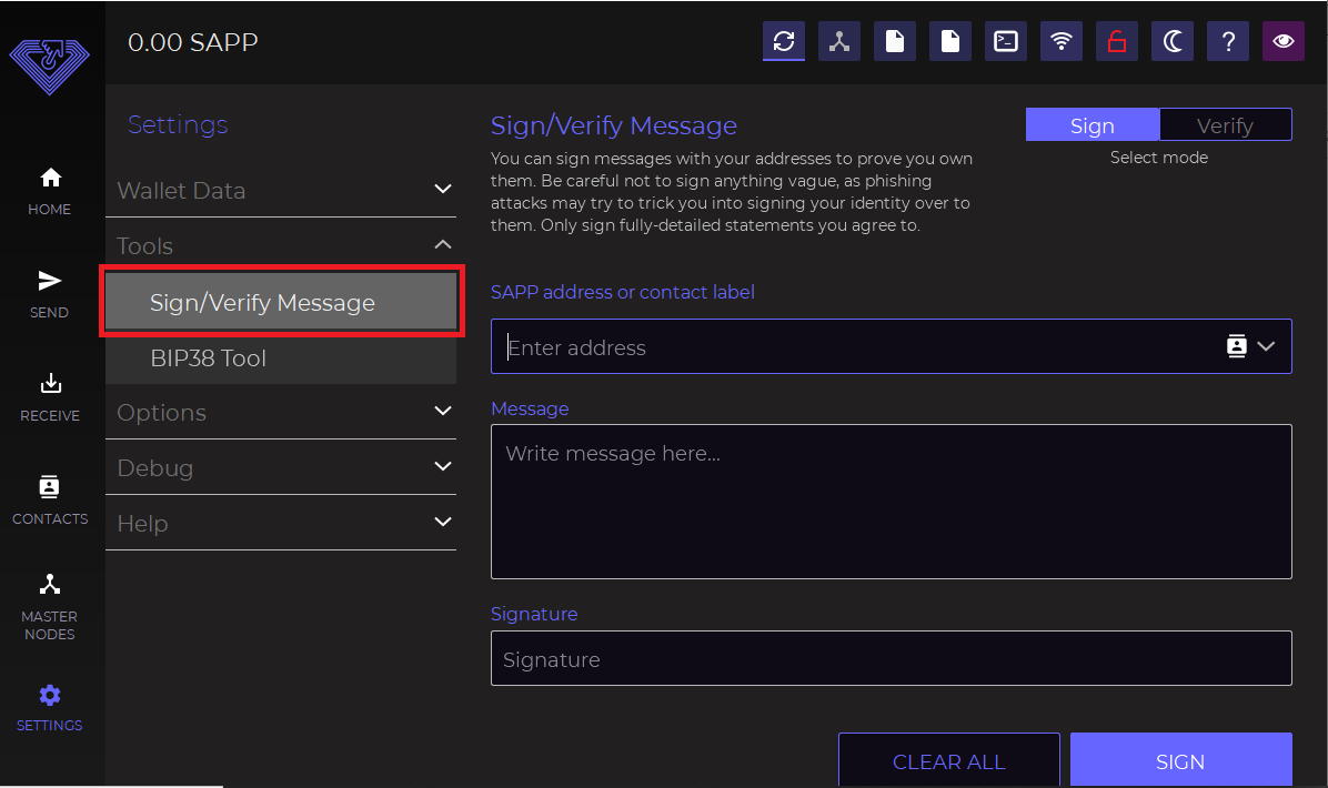 * Sign / Verify Message (from this section it is possible to sign a message to prove that you are the owner of an address, or to verify a signed message)