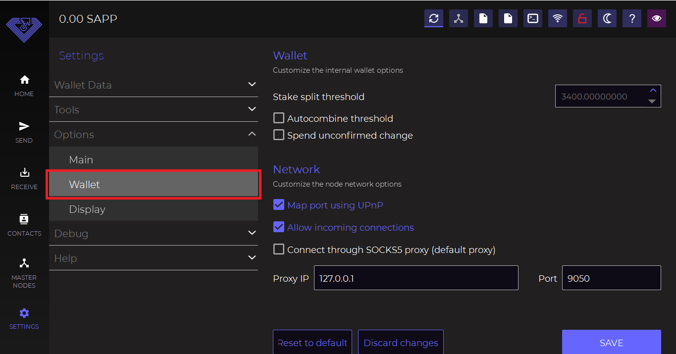 * Wallet (from here you can change some connectivity options or staking settings)